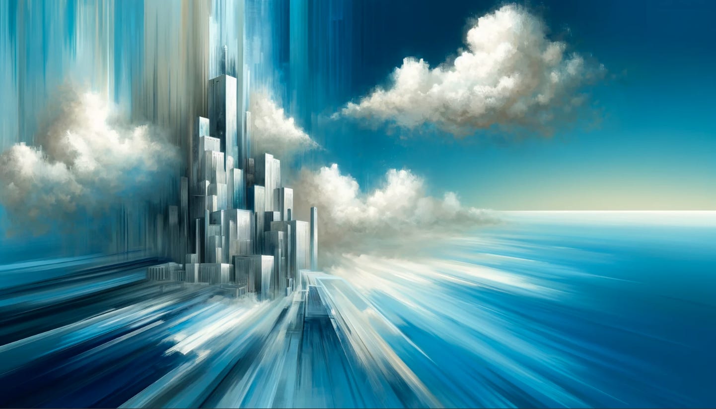 Prompt (generated using DALL-E 3): “A symbolic abstract painting that captures the concept of 'blue sky territory' for a company, representing clarity and constructive development. The image features a dominant, expansive blue sky, blended with light white clouds, symbolizing clear thinking and optimism. The lower part of the painting transitions into architectural structures being constructed, illustrated by rising geometric shapes in shades of gray and silver, embodying the building and shaping of ideas. This abstract composition conveys a sense of progress and forward movement in a visionary space.”