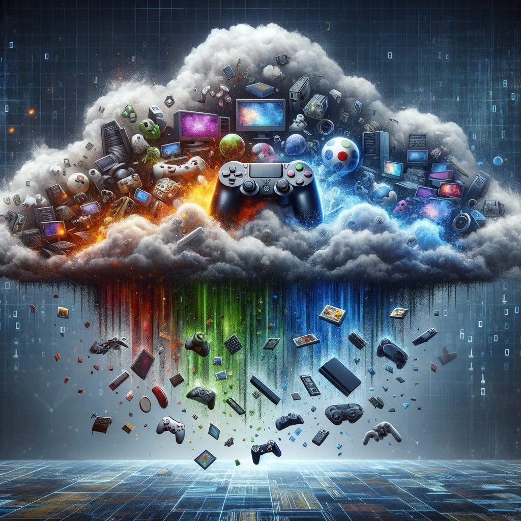 Prompt (generated using Dalle-3): “The image now prominently features well-known symbols of video gaming: game controllers, recognizable game characters, and iconic game consoles, all disintegrating into digital particles and fading away. The background is a digital landscape, with pixelated patterns and binary code elements, clearly indicating a digital realm. Above, the cloud representing cloud gaming and digital streaming is more defined, with visible streaming data lines connecting it to the disintegrating gaming elements. The scene is a clear representation of the transition from physical video game ownership to a digital, streaming-dominated world.”